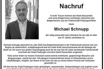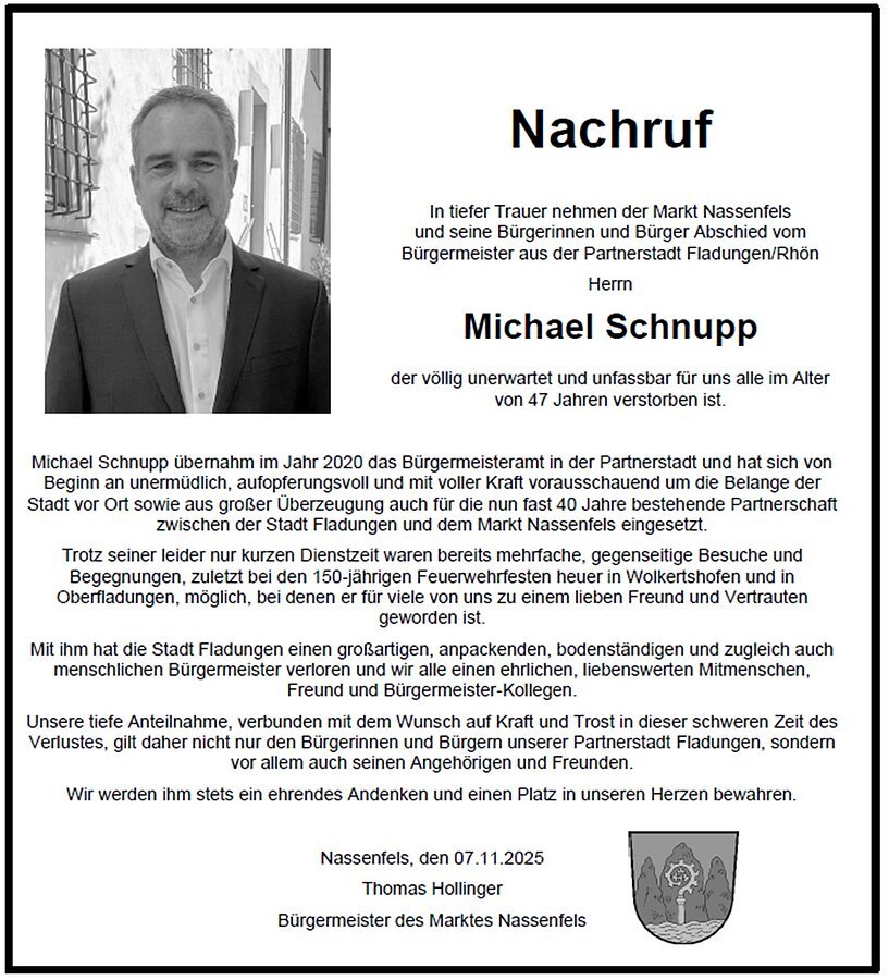 In tiefer Trauer nehmen der Markt Nassenfels und seine Bürgerinnen und Bürger Abschied vom Bürgermeister aus der Partnerstadt Fladungen/Rhön Herrn Michael Schnupp, der völlig unerwartet und unfassbar für uns alle im Alter von 47 Jahren verstorben ist.