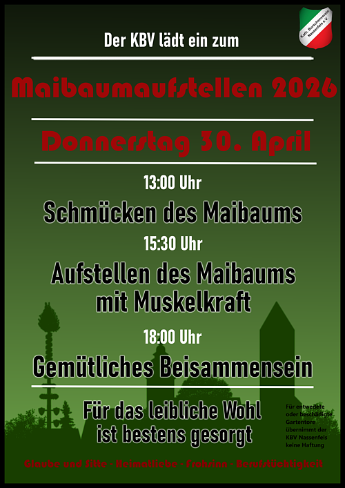 Am Dienstag den 30.04 ist es wieder soweit - der Maibaum 2026 wird eingeholt, geschmückt und aufgestellt. Wie jedes Jahr hoffen wir wieder auf zahlreiche Unterstützung, um den Baum traditionell mit Muskelkraft aufzustellen. Los geht's um 13:00 Uhr mit dem Schmücken des Baumes. Ab 15:00 Uhr wird der Baum dann mit Muskelkraft aufgestellt. Wenn der Maibaum dann steht gibt, es mit Burger, Steckerlfisch, Käse-/ Würstel-/ und Steaksemmel die besten Schmankerl vom Grill. Bei Schank- und Barbetrieb findet der Abend einen schönen Ausklang. Der KBV Nassenfels freut sich auf euer Kommen.